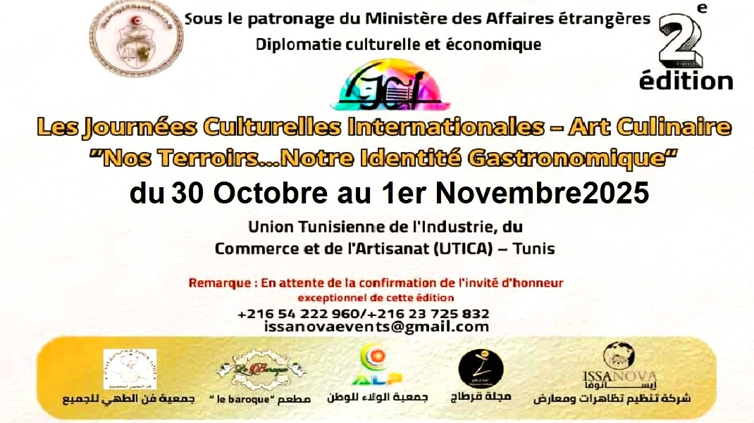 Aero-News (Journées Culturelles Internationales – Art Culinaire) – Forte du succès de sa première édition de 2024, la 2ème édition des Journées Culturelles Internationales – Art Culinaire est de retour à Tunis, du 30 octobre au 1er novembre 2025.