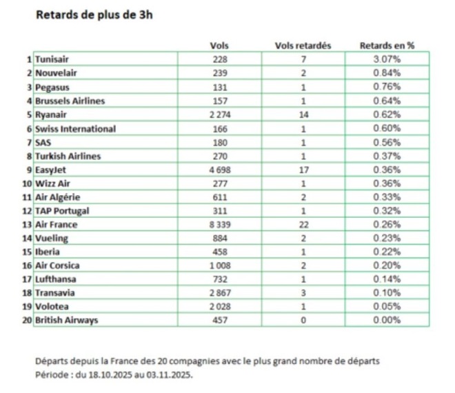 Aero-News (Tunisair et Nouvelair) – Une récente étude sur la ponctualité des compagnies aériennes en France, publiée par L’Écho Touristique et basée sur les données de Flightright, révèle que les vacances de la Toussaint 2025 ont été particulièrement difficiles pour les voyageurs. Parmi les compagnies les moins ponctuelles, deux transporteurs tunisiens, Nouvelair et Tunisair, se distinguent par des retards significatifs sur leurs vols au départ de France.
